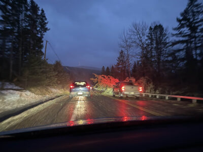 A giant pine tree leans over state Route 73 near the Cascade Welcome Center amid fierce winds reaching up to 70 miles per hour on Friday morning. Jess Collier, who took this photo, said this was one of two large downed trees she encountered on her commute, which was extended by 30 minutes that morning. (Provided photo — Jess Collier)