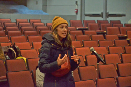 - Alison Simcox shares her thoughts with the Saranac Lake Central School District Board of Education at a hearing about the coming vote to potentially close Bloomingdale Elementary School. (Enterprise photo — Aaron Marbone)