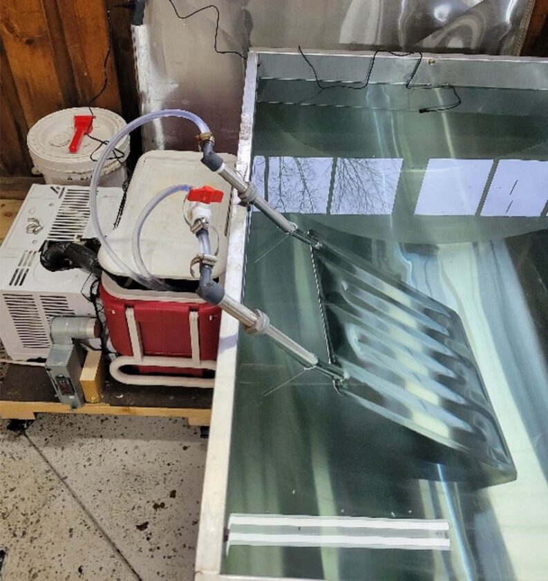 To build the chillers, Wild adapted window-size air conditioning units and connected plastic picnic coolers holding a food-grade glycol solution. The units were tested in combination with either a submersible wine chilling plate in a stainless steel tank or pumping sap from a reverse osmosis system through a 20-plate heat exchanger and a 1,500-gallon insulated dairy tank with its own cooling plates. The Upper Hudson Maple Producers Association provided the dairy tank for the testing.