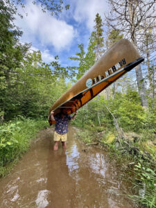 - Henry Kohler carries his canoe through muddy waters. (Photo provided)