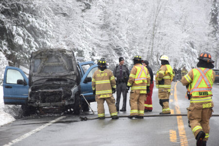 - Saranac Lake Volunteer Fire Department members and State Police respond to a a two-car motor vehicle crash and one-car fire on state Route 3, approximately one-half of a mile west of its intersection with the Bartlett Carry Road in the town of Harrietstown late Wednesday morning. At left is one of the vehicles that caught fire in the crash and was subsequently extinguished. (Enterprise photo — Chris Gaige)
