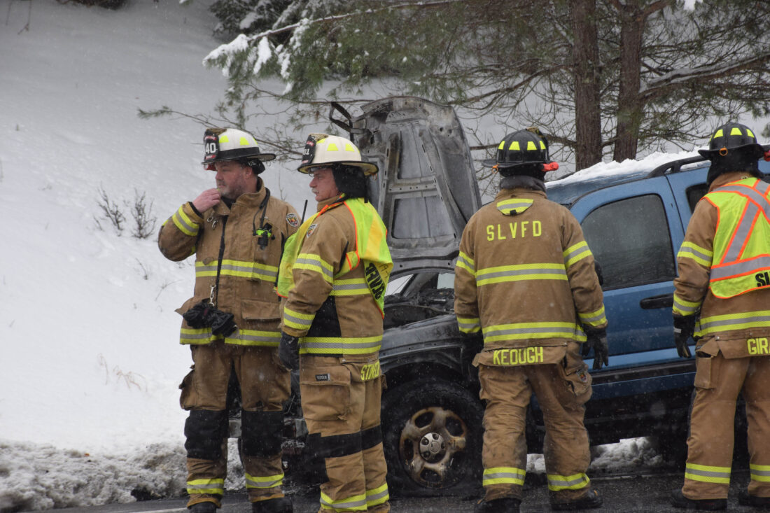 - Saranac Lake Volunteer Fire Department members and State Police respond to a two-car motor vehicle crash and one-car fire on state Route 3, approximately one-half of a mile west of its intersection with the Bartlett Carry Road in the town of Harrietstown late Wednesday morning. At left is the Jeep Liberty that caught fire in the crash and was subsequently extinguished. (Enterprise photo — Chris Gaige)
