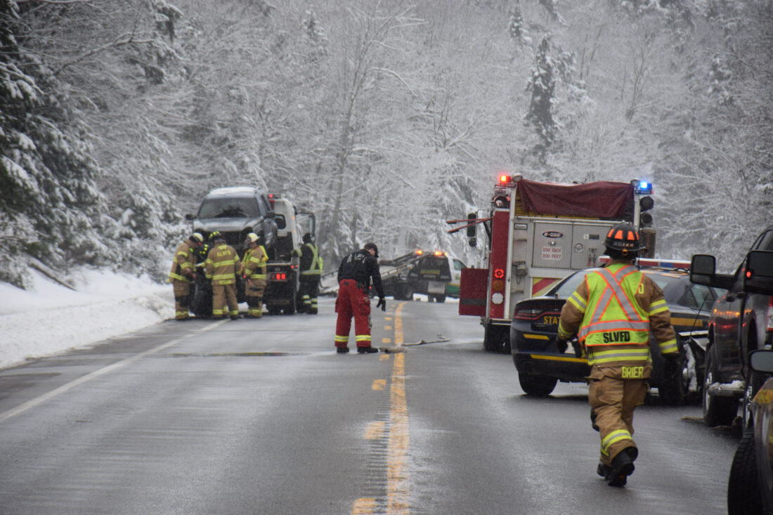 Saranac Lake Volunteer Fire Department members and State Police respond to a a two-car motor vehicle crash and one-car fire on state Route 3, approximately one-half of a mile west of its intersection with the Bartlett Carry Road in the town of Harrietstown late Wednesday morning. At left is one of the vehicles that caught fire in the crash and was subsequently extinguished. (Enterprise photo — Chris Gaige)