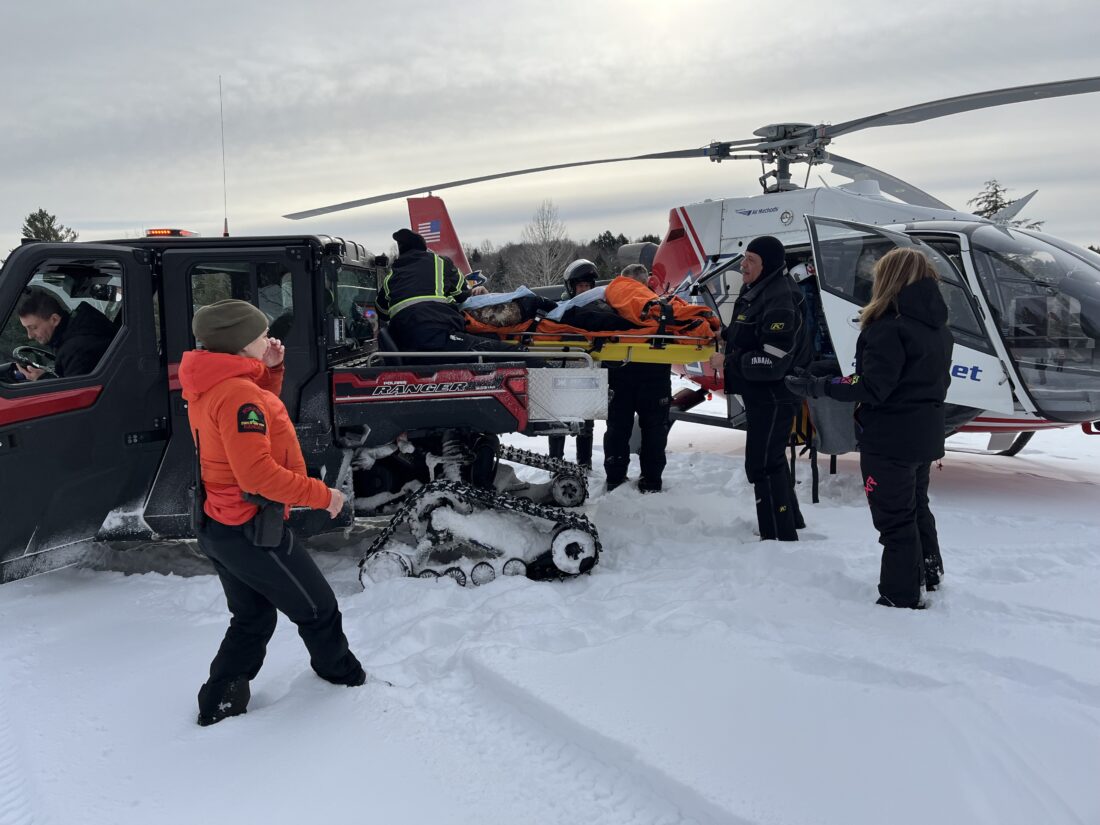 RAQUETTE LAKE — Ray Brook dispatch received a call from the Hamilton County Sheriff’s Office requesting forest ranger assistance with a snowmobile crash off Uncas Road in the Moose River Plains Wild Forest at 12:19 p.m. on Sunday, Dec. 28. Forest Ranger Lieutenant Marie Arnold and Ranger Melissa Milano responded with the Raquette Lake Volunteer Fire Department, Raquette Lake and Inlet Emergency Medical Services, New York State Police and Inlet Police. Rescuers found the 61-year-old from Amityville approximately 10 feet off the trail, in the woods. The snowmobiler had been ejected from the snowmobile while rounding a corner. The patient had unstable pelvis and leg injuries. Rescuers packaged the patient into the Raquette Lake Volunteer Fire Department’s tracked utility terrain vehicle. The UTV transported the injured snowmobiler to a nearby LifeNet helicopter that flew the patient to the hospital. Resources were clear at 1:50 p.m. The snowmobiler’s post-rescue medical status was not provided.