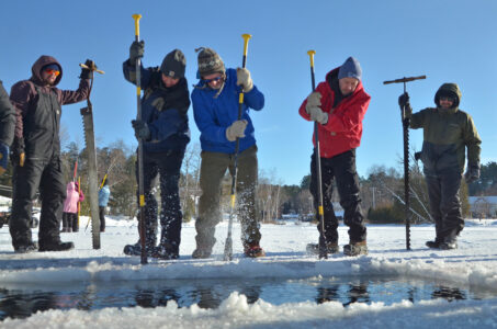 Greg Washburn and C.J. Nicastro saw and grin as they cut out ice blocks for the Ice Palace with the IPW 101 on a frosty Wednesday morning.
