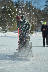 Ice chunks fly as Garrett Foster uses a homemade saw built by Harry Duso in 1939 to cut out ice blocks for the Ice Palace with the IPW 101 on a frosty Wednesday morning.