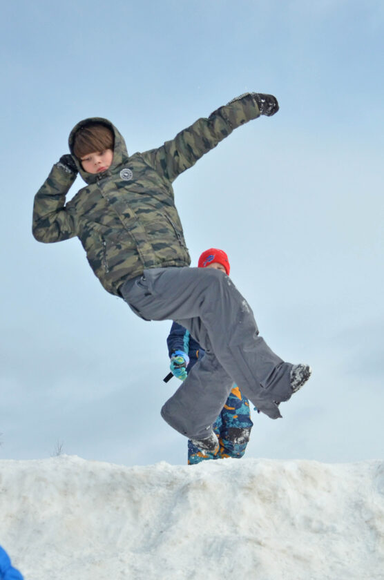 - Ty Figueroa-Brownell leaps down a snowy hill during recess at St. Bernard’s School on Tuesday. (Enterprise photo — Aaron Marbone)