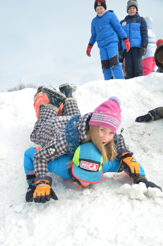 St. Bernard’s School students in third, fourth and fifth grades pose on a snowy hill before sliding down during recess on Tuesday. (Enterprise photo — Aaron Marbone)