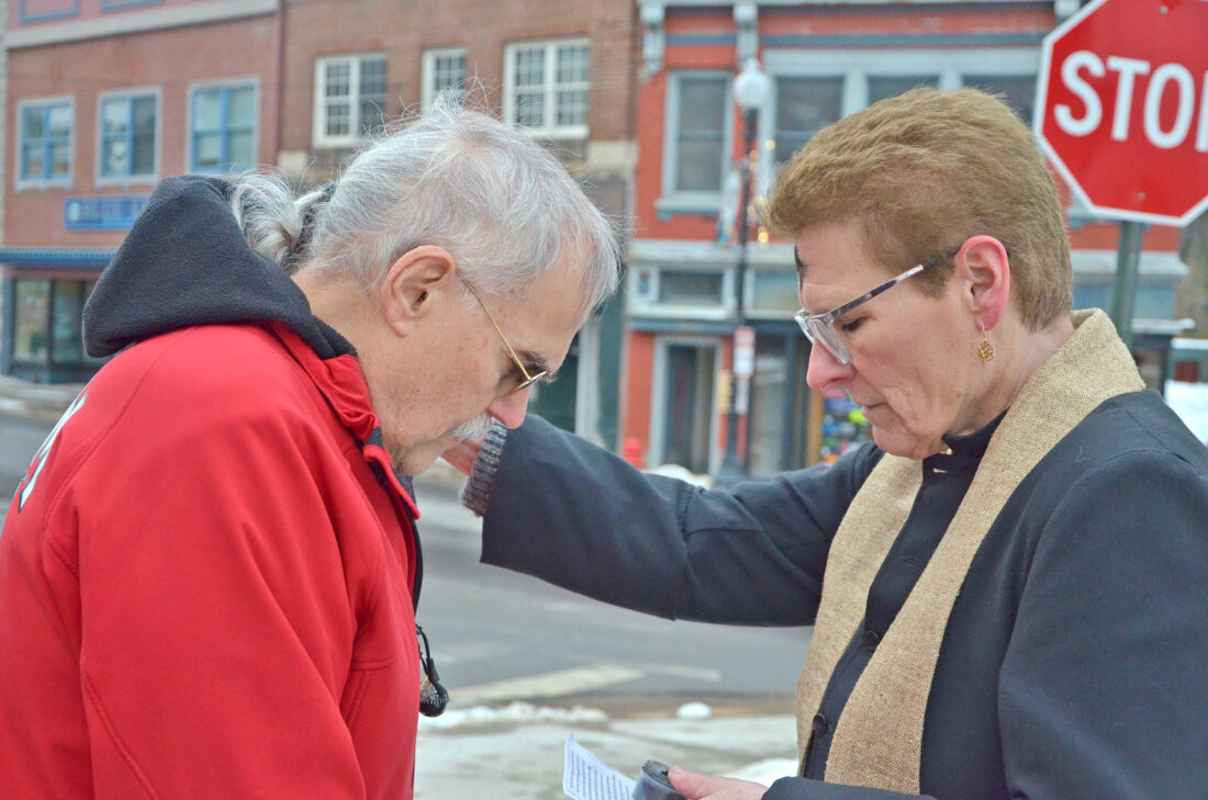 SARANAC LAKE — Rev. Denise Cabana from St. Luke’s Episcopal Church stood at the corner of Berkeley Green on Ash Wednesday, praying with members of the church and passersby and smearing a bit of ash onto their foreheads in the shape of a cross.
