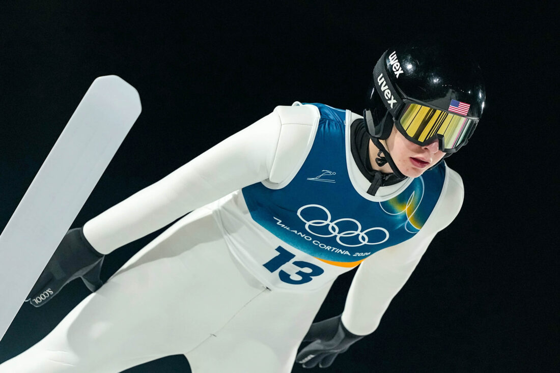 Tate Frantz, of the United States, soars through the air during his first round jump of the ski jumping men's normal hill individual at the 2026 Winter Olympics, in Predazzo, Italy, Monday, Feb. 9, 2026. (AP Photo/Matthias Schrader)