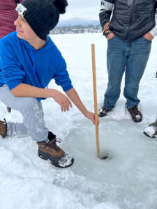 Baker’s class has been working with Paul Smith’s College Natural Sciences Professor Curt Stager, who joined them for one of their Mirror Lake ice measurement trips. He helped explain some of the evidence of climate change and its effects in the Adirondacks, such as shorter seasonal ice durations and thinner ice.