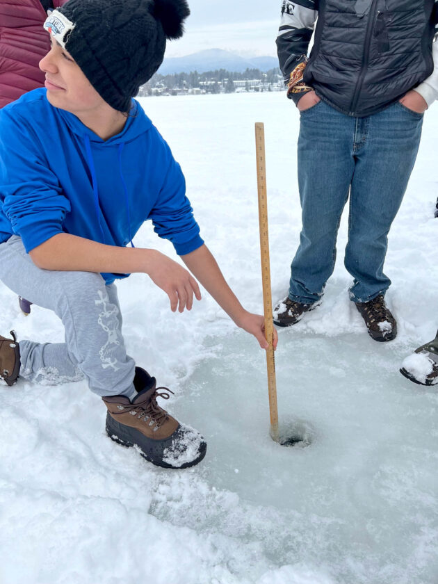 - Lake Placid High School student Bentley Kennedy measures the ice depth on Mirror Lake in the village of Lake Placid on Tuesday, Jan. 6. (Provided photo)