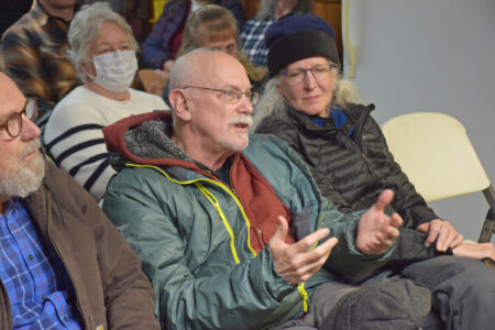 - Lewis resident Barry Goldstein speaks during a public information session hosted by Protect the Adirondacks! at the Lewis firehouse on Monday evening. Protect! is one of the hearing parties to an upcoming Adirondack Park Agency adjudicatory hearing for the project, which it opposes.