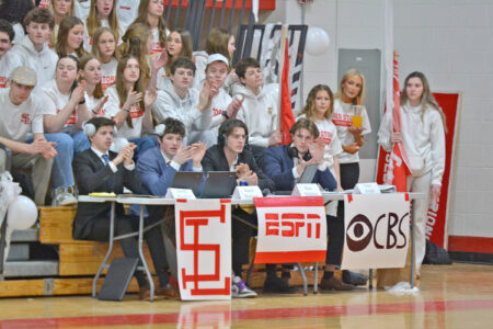 “ESPN” and “CBS” cover the Saranac Lake boys basketball game on Saturday. (Enterprise photo — Parker O’Brien)