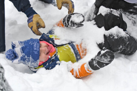 - Young Jaxs Alexanian is filled with joy while being buried in snow during halftime of the Saranac Lake Winter Carnival rugby game on Saturday at the Elks Field. (Provided photo — Lou Reuter)