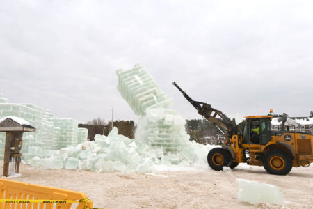- A village worker topples the tower as the 2026 Saranac Lake Winter Carnival Ice Palace is demolished Monday afternoon. Rising to a height of 32 feet, the tower was the tallest part of this year’s palace, which was constructed of approximately 3,000 blocks of ice that were 20 inches thick and weighing up to 800 pounds each. (Provided photo — Lou Reuter)