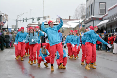 - Amy Cheney-Seymour and the other Road Runners dance with Soma Beats in the 2026 Saranac Lake Winter Carnival gala parade Saturday afternoon. (Provided photo — Lou Reuter)