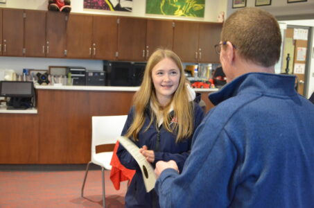 Amelia Evans receives an award from Saranac Lake Board of Education Chair Mark Farmer. She was one of the Saranac Lake girls Nordic team members honored at a school board meeting on Wednesday for winning the state championship. (Enterprise photo - Aaron Marbone)