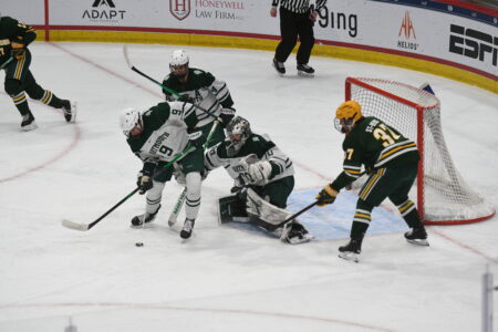 Dartmouth defenseman Colin Grable attempts to control the puck in front of Big Green goaltender Emmett Croteau during the opening period of Friday’s ECAC Men’s Ice Hockey Championships semifinal game at the Olympic Center in Lake Placid. Also pictured are CJ Foley of Dartmouth and Clarkson’s Mael St-Denis.