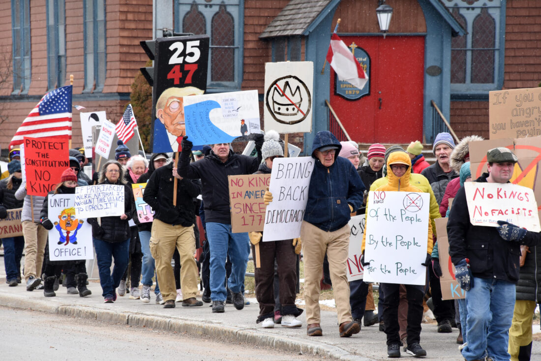- Protesters march past the Church of St. Luke in Saranac Lake during the “No Kings” rally on Saturday. (Provided photo — Mark Kurtz)