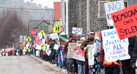 The gathering, which included a rally in Riverside Park, march around downtown Saranac Lake and a honk-and-wave along River Street, was co-organized by Adirondack People Power and Adirondack Voters for Change.