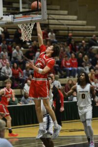 - Saranac Lake’s Cedar Crist lays up a shot during Saturday’s NYSPHSAA Regional final against KIPP Capital Region at Hudson Valley Community College in Troy. (Enterprise photo — Parker O’Brien)