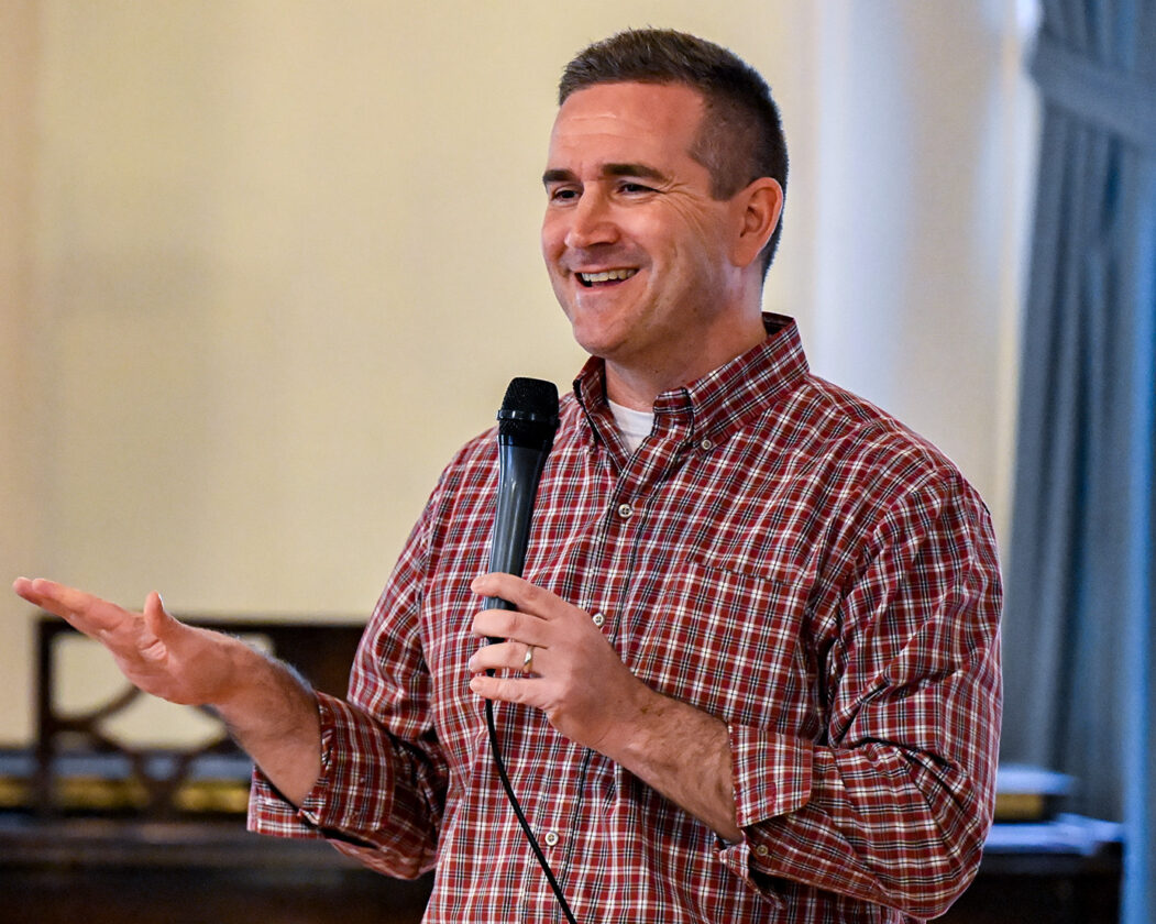 Democratic congressional candidate Blake Gendebien speaks to supporters at the Van Alstyne Homestead Museum in Canajoharie on Saturday. (Gazette photo — Peter R. Barber)