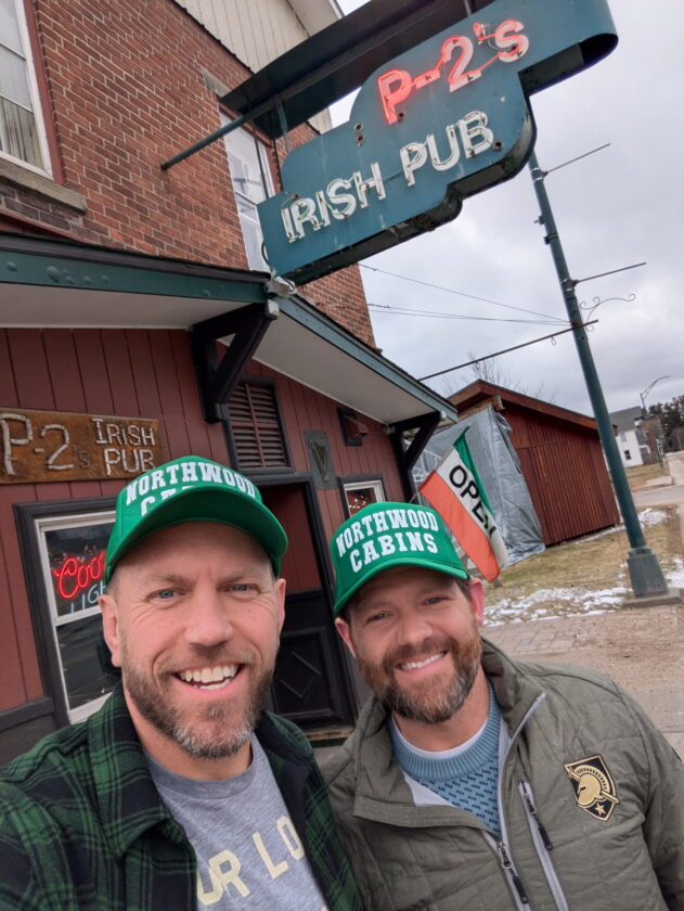 - The Northwood Cabins’ new owners, Matt Showalter, left, and Chris Davis smile for a selfie in front of P-2’s Irish Pub in Tupper Lake. (Provided photo)