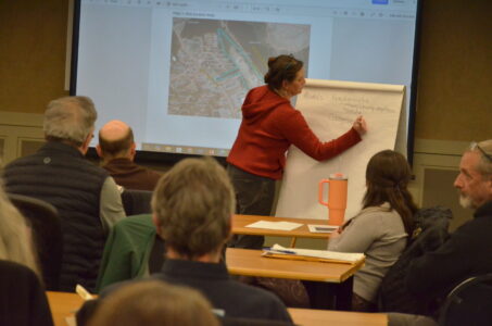 Northern Forest Center Adirondack Program Director Leslie Karasin leads a discussion of the proposed project to put housing at the Saranac Lake village-owned sand pit last week. (Enterprise photo — Aaron Marbone)