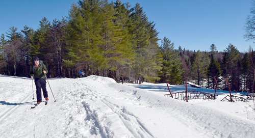 My friend Neilson Snye, of Tupper Lake, and I began skiing on the crusty trail, which is actually a road, so it’s plenty wide enough to handle skiers and snowshoers at the same time. But the previous two days of above-freezing temperatures and below-freezing nights ensured that the last tracks of the previous day were set in stone.