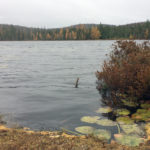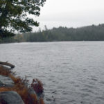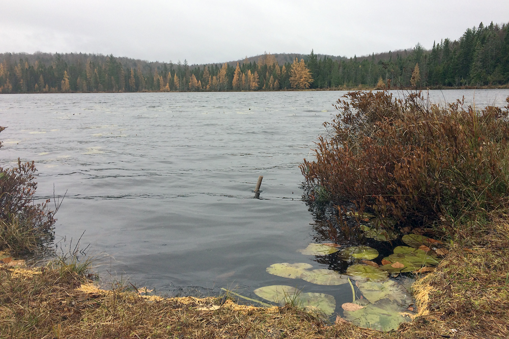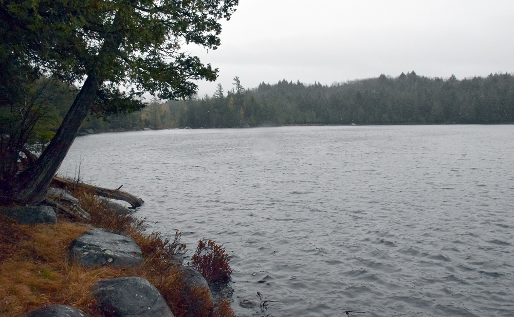 Although it was a gray day with driving rain, a stand of tamaracks on the far shore gave a shock of rusty gold to the shoreline. On a clear day, the High Peaks would dominate the view to the south.