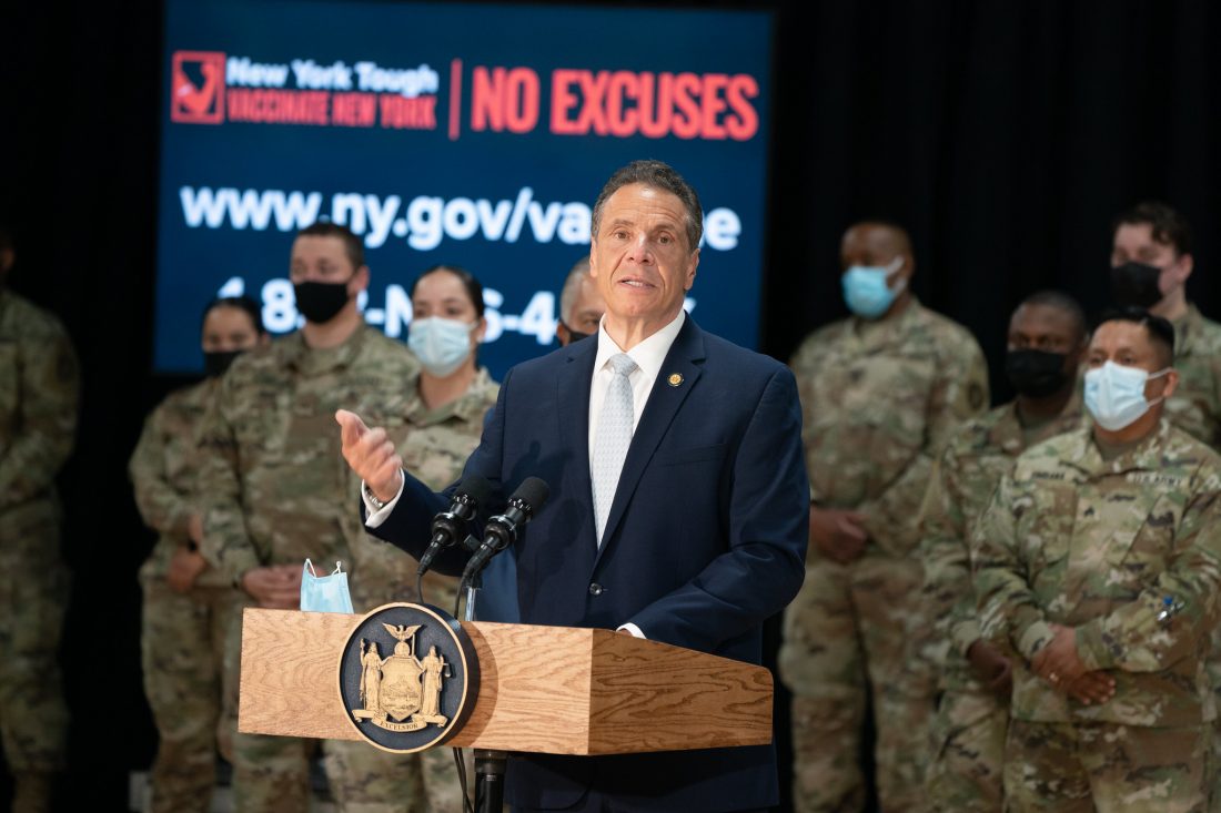 New York Gov. Andrew Cuomo announces Wednesday that beginning Friday, 16 mass vaccination sites will accept walk-in appointments for people age 60 and older. (Provided photo — governor's office)