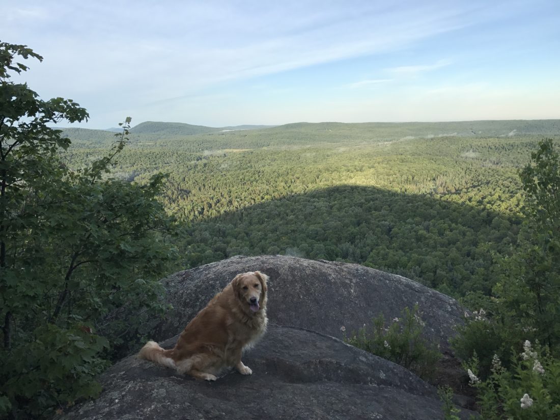 My dog has already made herself at home. She welcomes the opportunity to be off the leash to wander as she pleases. The wooded path leads through a young forest and around large boulders. There a few herd paths, but the trail markers keep us headed in the right direction. The tree line starts to thin and glimpses of the view are peeking through the branches. The dog is the first to reach the open ledges and waits patiently by a picnic table.
