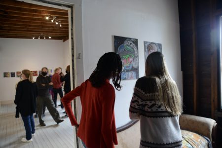 Monica Sara Mzese is seen here, left, at the opening of her art show on Sunday, Oct. 17.