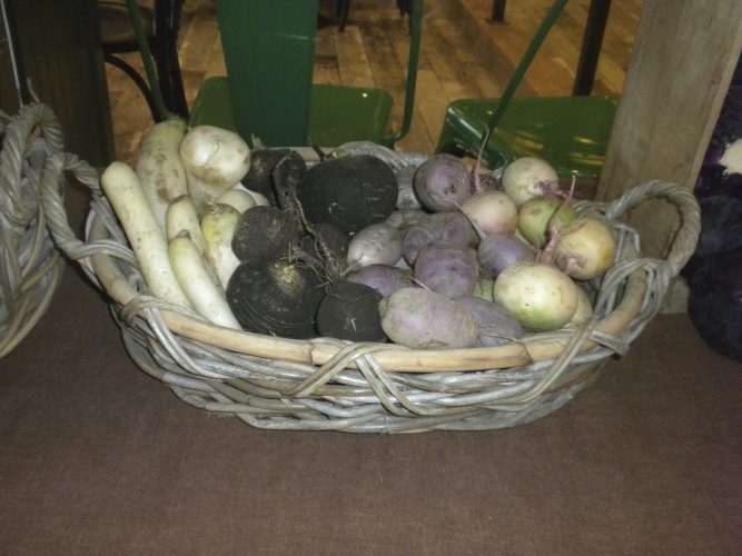 There are three kinds of radishes at our winter farmers’ market at the Hotel Saranac: watermelon, Daikon and black.