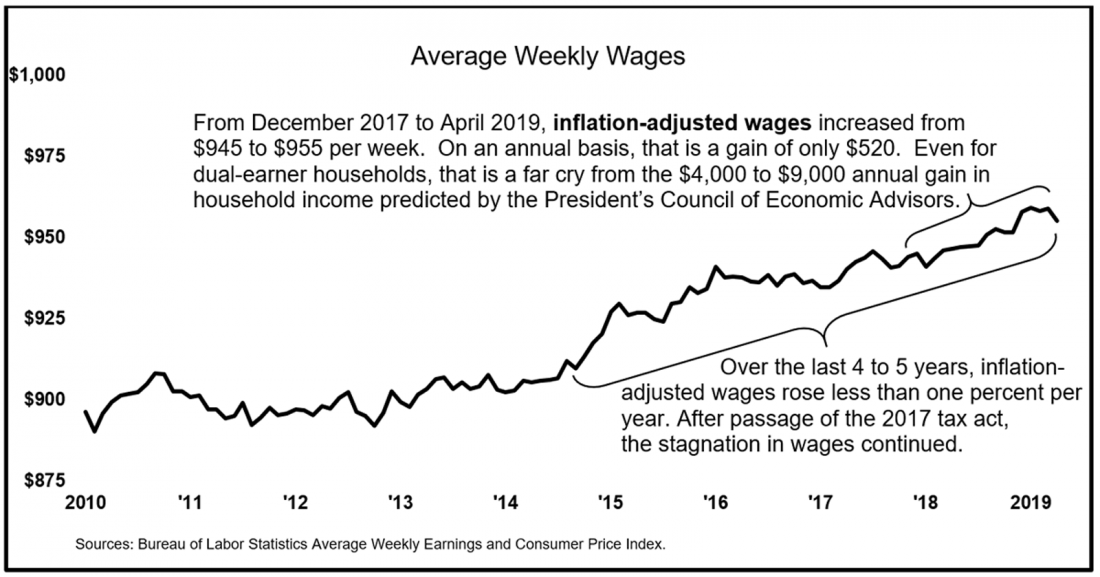 Another outlandish projection made by the president’s CEA, which was repeated over and over by the president, was that household income would increase by up to $9,000 per year as a result of the tax cuts. The CEA’s report said conservative estimates “imply an increase in average household income of $4,000 and more moderate estimates show increases of $9,000.” Note: Those were estimates for before-tax income, not after-tax income. In sharp contrast, the CRS’s report found “no indication of a surge in wages in 2018, either compared to history or relative to GDP growth.” Wage data from the Department of Labor’s Bureau of Labor Statistics shows little change in the growth of wages over the last 10 years as well as after the passage of the 2017 tax act. As shown in the chart, from December 2017, when the 2017 Tax Cuts and Jobs Act took effect, to April 2019, inflation-adjusted wages have increased by only about $10 per week or $520 per year. Even for dual-earner households, that is a far cry from the $4,000 to $9,000 annual gain in household income predicted by the president’s CEA.