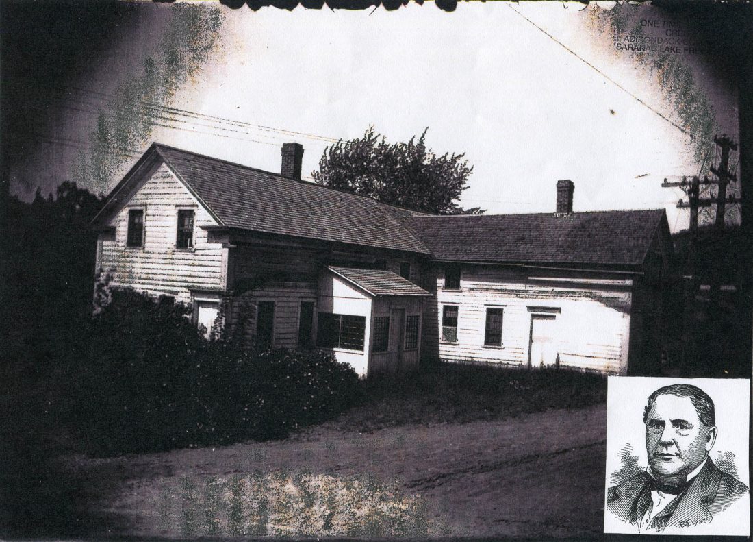 “Baker’s Tavern,” as it appeared in the 1920s shortly before its demolition. Col. Milote Baker (inset) officially named this settlement Saranac Lake, in 1854, for the U.S. Post Office he had built inside his store on present day Triangle Park. (Photo provided)