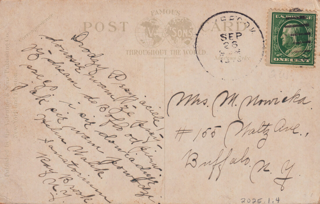 Historic Saranac Lake needs your help identifying the who, what, where, when and/or why of this photo. We have another postcard in need of translation! We do not know what language this message is written in, but we suspect it’s Polish. The front of the card features an image of the Main Building at Trudeau Sanatorium, and the card is postmarked Ray Brook, so it’s possible it is a message sent by a patient. Can you help us translate this? Let us know by calling the museum at 518-891-4606 or emailing mail@historicsaranaclake.org. (Photo provided — Historic Saranac Lake Collection, 2025.1.4. Gift of Ann Pecora Diamond)