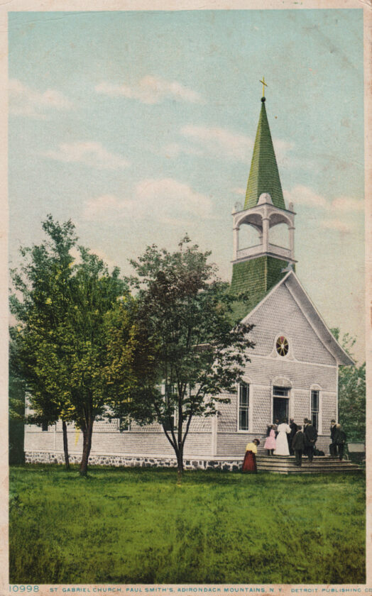 This postcard, mailed in 1909, shows St. Gabriel the Archangel Catholic Church in Paul Smith’s. The church was likely just over 10 years old when this postcard was printed by the Detroit Publishing Company. The land for St. Gabriel’s was donated by Paul Smith. A small entryway was added at some point, but otherwise the exterior of the church still looks about the same today. (Photo provided — Historic Saranac Lake Collection, 2025.7.38.)