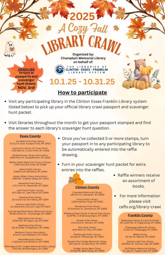 The Champlain Memorial Library is once again organizing A Cozy Fall Library Crawl on behalf of the Clinton/Essex/Franklin Library System. For more information, please visit one of the 30 libraries on the list. The deadline to turn in passports and scavenger hunt forms is November 3. Enjoy visiting your area libraries!