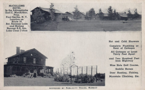 This postcard was mailed 85 years ago from Paul Smiths, New York. The card shows the McColloms Hotel around 1940, and lists all of the amenities available to travelers. The tourist who mailed this said, “this beats the city.” Happy travels! (Provided photo — Historic Saranac Lake Collection, 2025.3.77. Gift of an anonymous donor.)