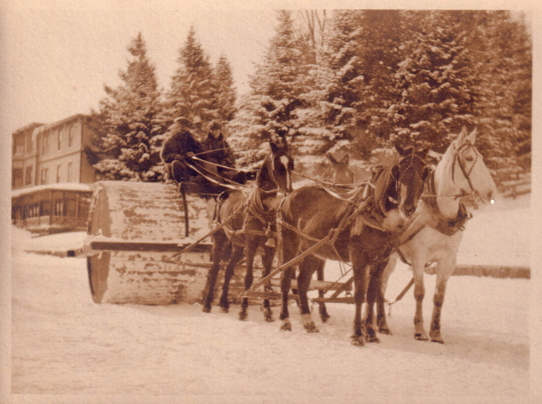 Are you tired of shoveling all this snow? How about a snow roller?! These heavy wooden rollers would be drawn by horse teams and would compact the snow to allow passage for sleighs and other transportation. This was, unsurprisingly, cold and hard work. Sometimes when the snow was too high, it had to be shoveled down enough to pack, and drivers sat high in the air unprotected from winter winds. Stay warm out there! (Photo provided — Historic Saranac Lake Collection, 2022.17.31. Gift of the Rice and Duquette Families.)