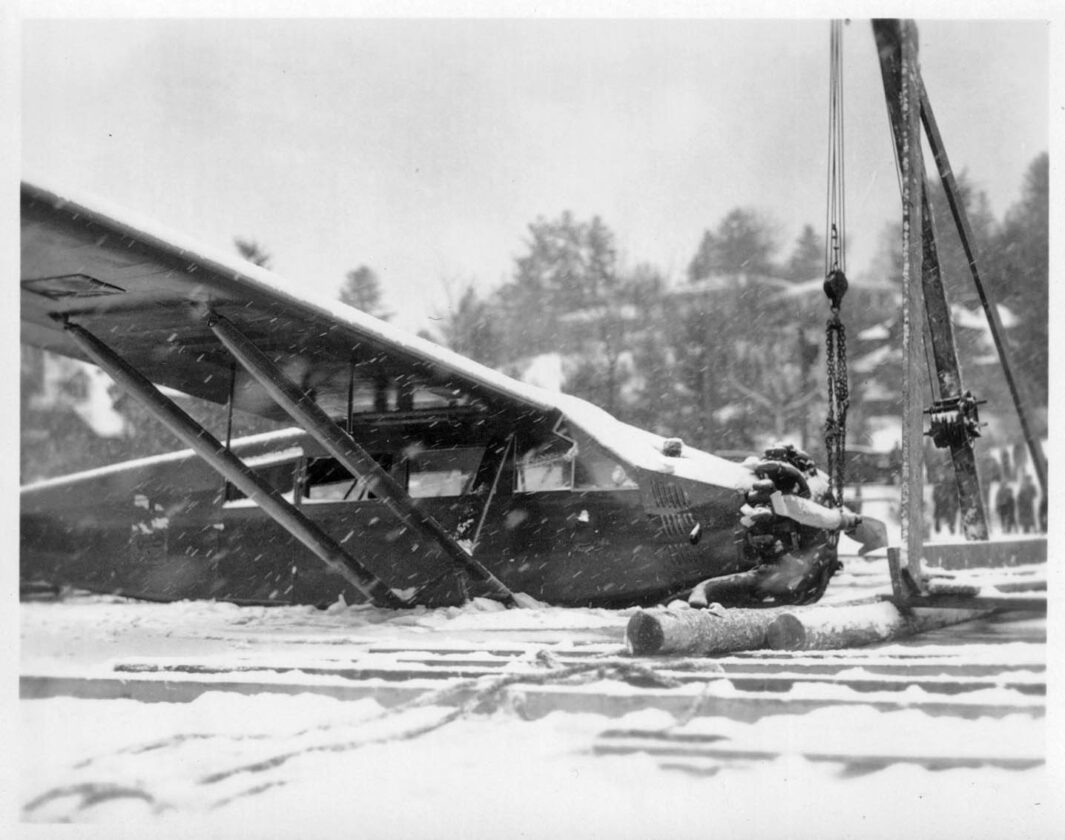 This photograph was taken almost 96 years ago, on Dec. 29, 1929. This Travel-Aire plane was lent to the Syracuse branch of the Curtiss-Wright Flying Service to provide 12 weeks of sightseeing services in Lake Placid. The plane was about to take off from Lake Flower to head back to Lake Placid when the nose sunk through the ice. The three passengers, pilot and mechanic were drenched but safely made it off the plane. All five were taken to the Elks Club to warm up and change into dry clothes. A week prior to the accident, the plane had made a record trip from New York City to Lake Placid in just two hours and 15 minutes. (Photo provided — Historic Saranac Lake Collection, 2024.2.62. Gift of Gus Dueben.)