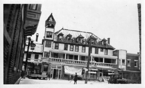 This photograph was taken 101 years ago, sometime after the FIRST fire at the Berkeley House on Jan. 8, 1925. This shot was taken from Academy Street, looking across Main Street to what is now Berkeley Square. The Berkeley House was rebuilt and remained open until it burned down for a second time on Jan. 10, 1981. Do you remember the second fire? Learn more about the Berkeley at wiki.historicsaranaclake.org/index.php/Berkeley_House (Provided photo — Historic Saranac Lake Collection, 2019.2.3. Gift of Ruth Levy.)