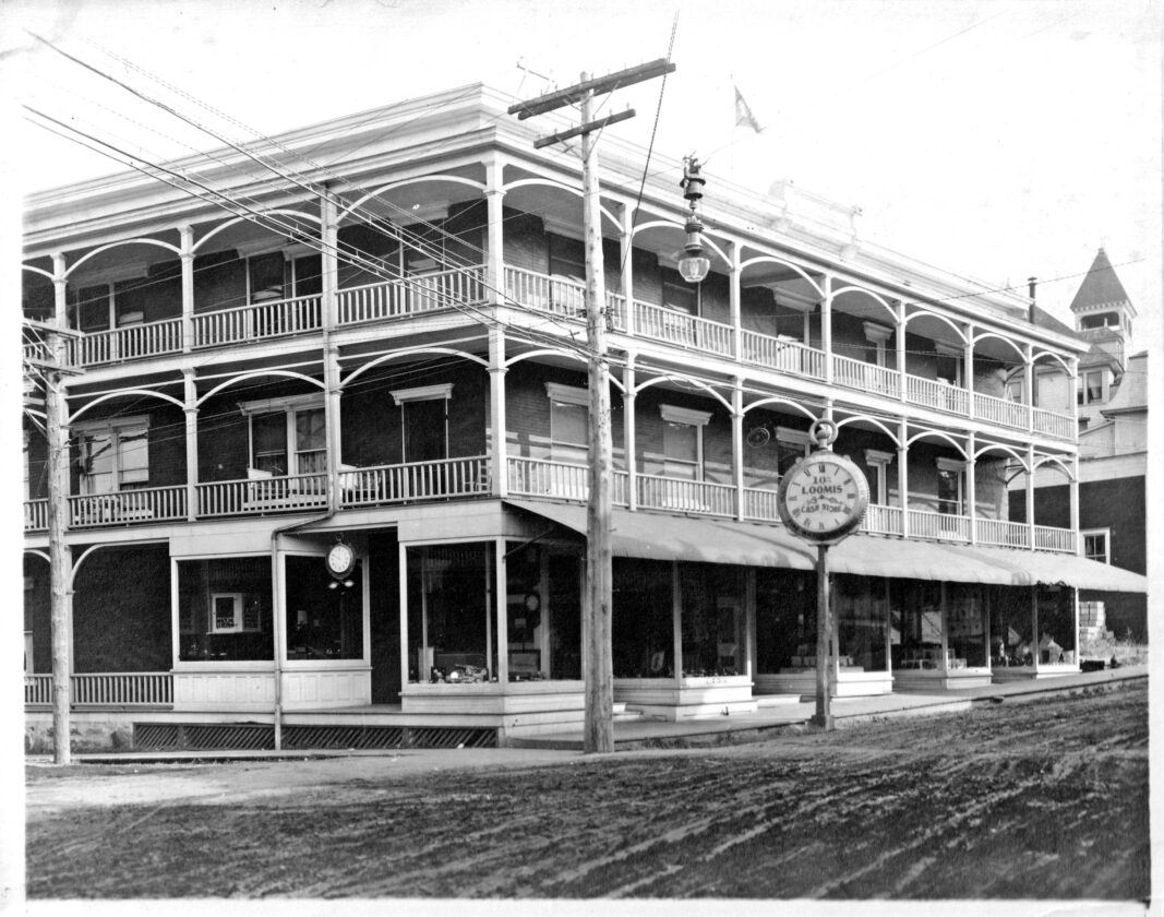 This photograph was recently donated to our collection. It shows the Loomis Block on Broadway, prior to the fire that destroyed the third floor in the 1920s. From the mid-1890s, the building was home to the Loomis General Store, which sold packbaskets, traps and other hunting equipment. The store also carried school supplies and all the necessary books for Saranac Lake schoolkids. A 1906 advertisement for the store included Edison Talking Machines. (Photo provided — Historic Saranac Lake Collection, 2025.32.1. Gift of Barbara Connolly.)