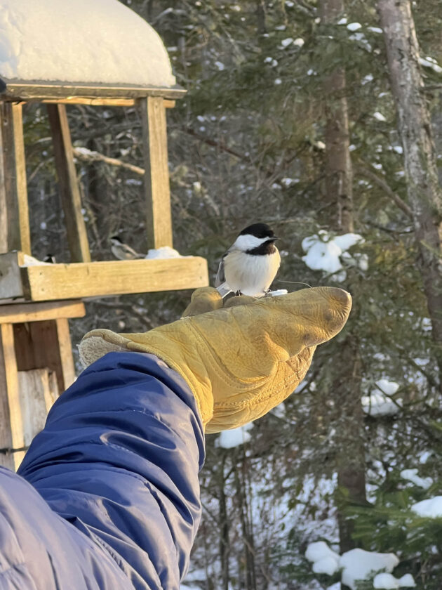 A chickadee lands on an outstretched hand holding birdseed. (Provided photo — Diane Chase)