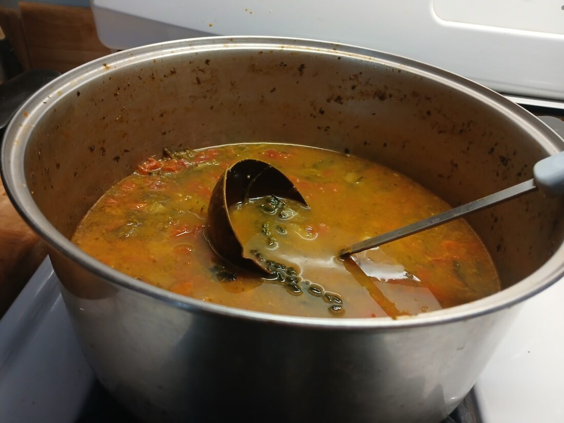In the meantime, strip kale and collards from stems and chop all the greens. Add them to the soup kettle. Cook until greens are done to your liking. It takes longer for kale and collards, less for chard and radish tops.