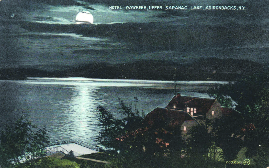 This recently donated postcard shows the Wawbeek Hotel under the light of a full moon. The Wawbeek was located on Upper Saranac Lake, and the original hotel was only in operation from 1889 to 1913. It was a lavish operation and the high costs ultimately led to its closure. Fun fact about these moonlight cards: The images were taken in the daytime, but the postcards were hand-colored for printing. The nighttime scenes have simply been modified to appear as though they were taken under the glow of the moon. We have seen identical daytime and nighttime images on different postcards. Talk about getting more bang for your buck! (Photo provided — Historic Saranac Lake Collection, 2026.17.3. Gift of the St. Lawrence County Center for History & Culture)