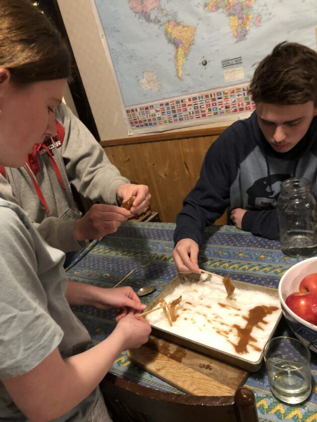 Be careful that it doesn’t burn or boil over. Once it has boiled for 3-5 minutes, it starts to thicken. Take the pan off the stove and drizzle the hot liquid over the snow in lines. As the liquid cools, the maple will harden. Using the popsicle stick or spoon, swirl the candy onto the utensil and eat!