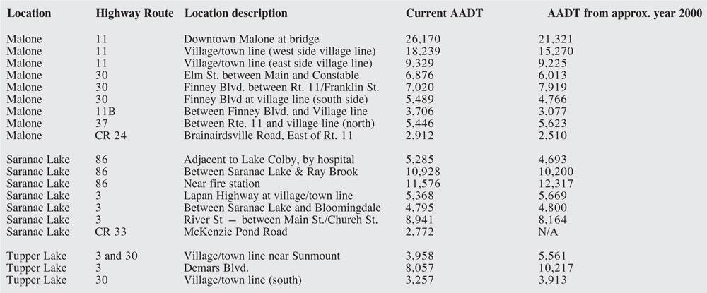 With the assistance of DOT’s Brian Staie, the following spread sheet compares a number of roads in the Malone, Saranac Lake and Tupper Lake villages and surrounding roads with the most recent AADT counts and those from around the year 2000. You can see by the figures most counts have increased somewhat, but not all.